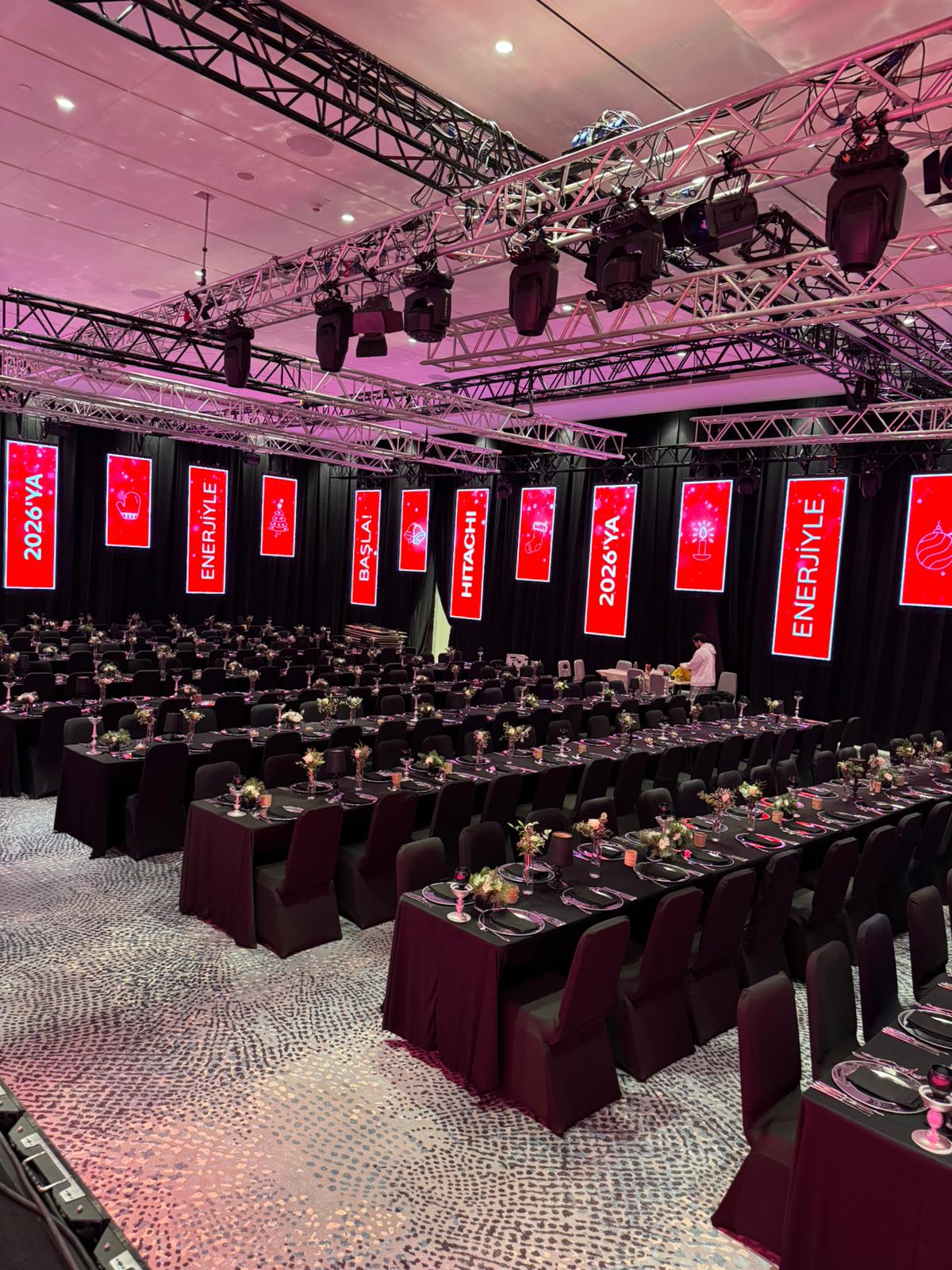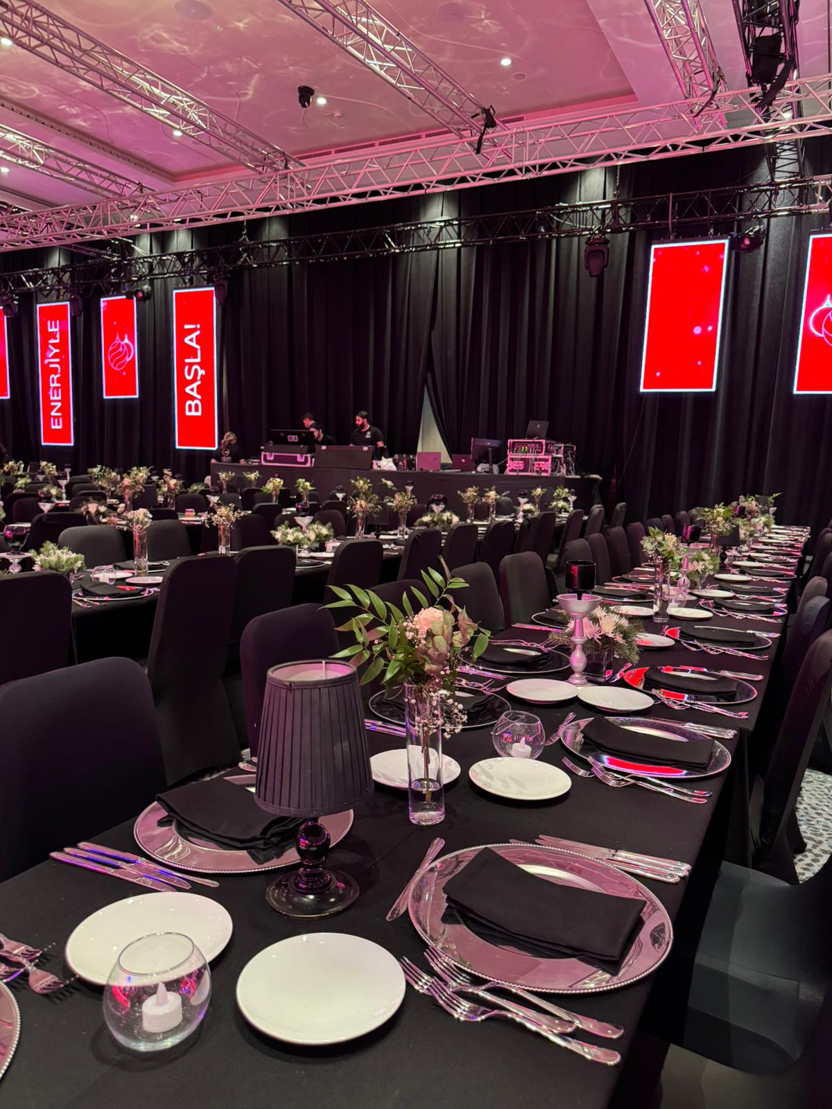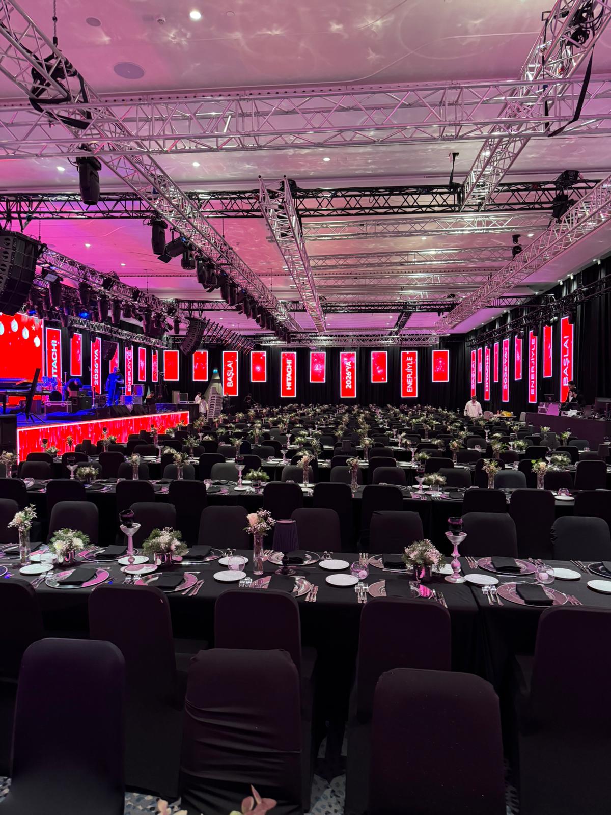 Sahne ve Işık: Kurumsal renklerle (Kırmızı-Siyah) uyumlu sahne ve ışık gösterileri ile bütünleşen oturma düzeni.